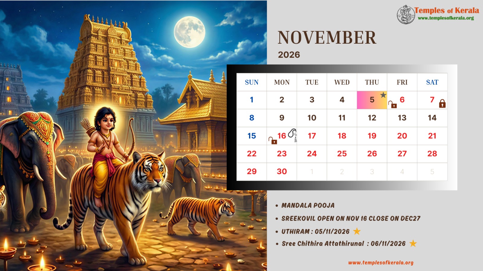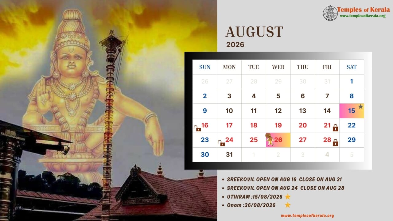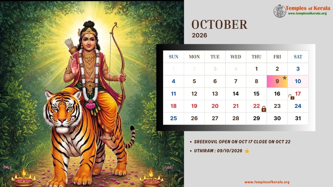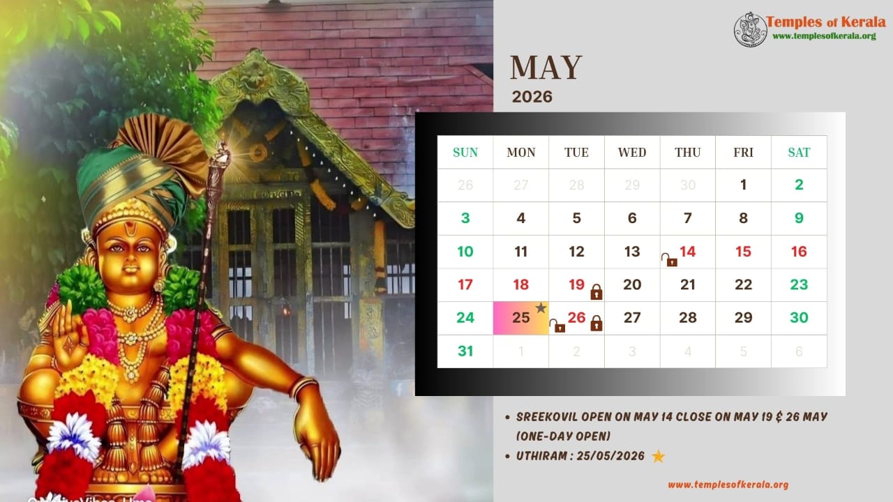 These January–December 2026 calendar images are dedicated to Sabarimala Sree Dharma Sastha Temple and present detailed monthly date layouts with devotional artwork. Each calendar highlights Sree Kovil open and close dates, important pooja days, and major observances. Special attention is given to Uthiram (Uthram) nakshatram days, marking them clearly for devotees. The combination of sacred visuals and practical temple information helps worshippers plan darshan and rituals throughout the year.