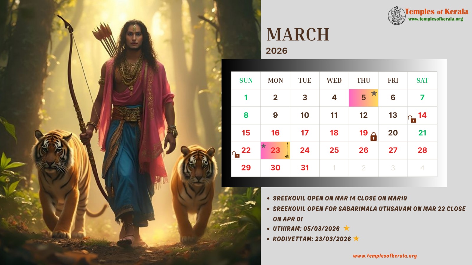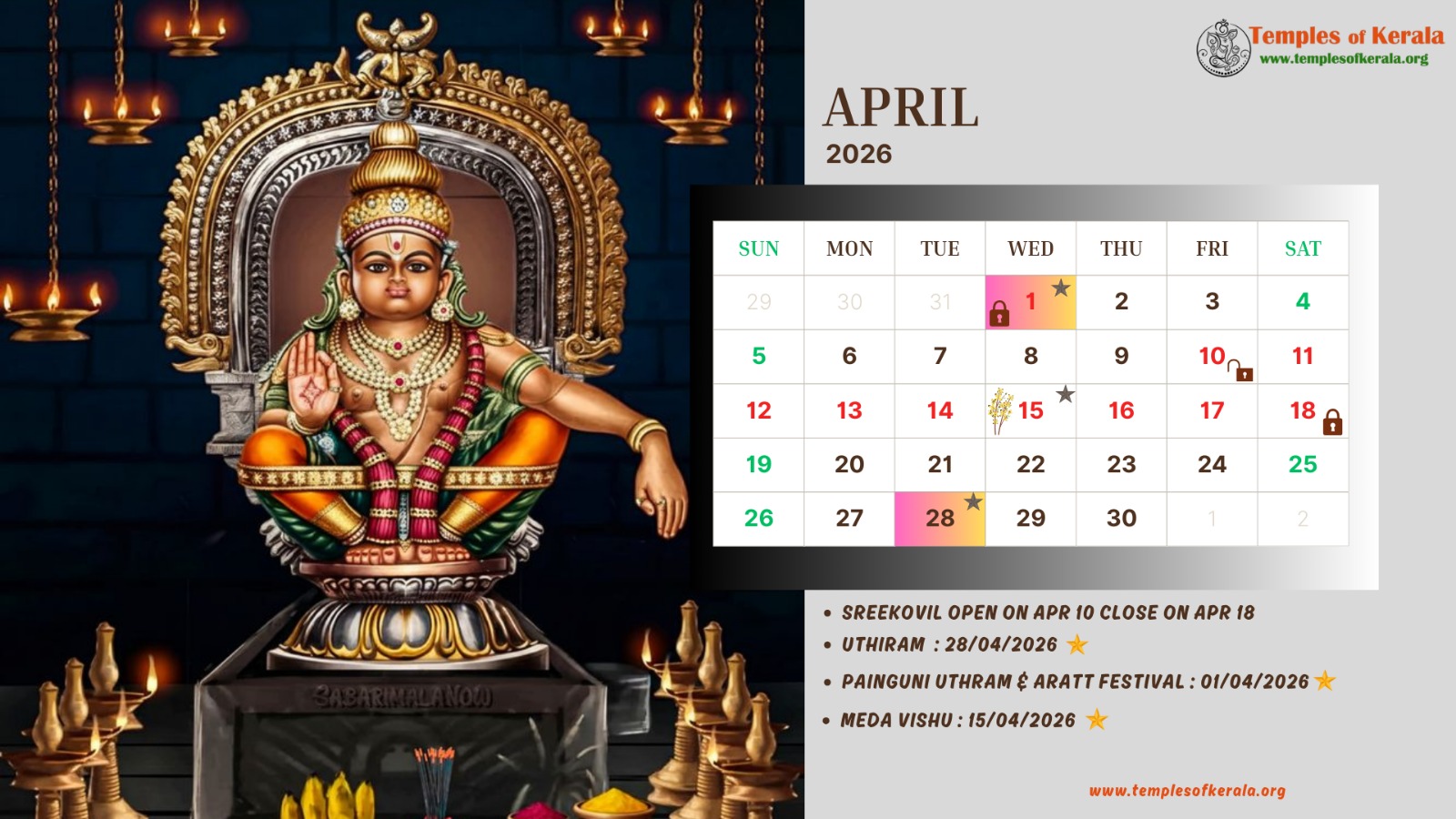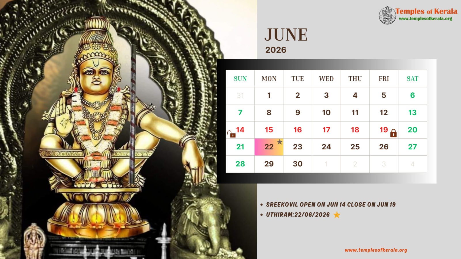 These January–December 2026 calendar images are dedicated to Sabarimala Sree Dharma Sastha Temple and present detailed monthly date layouts with devotional artwork. Each calendar highlights Sree Kovil open and close dates, important pooja days, and major observances. Special attention is given to Uthiram (Uthram) nakshatram days, marking them clearly for devotees. The combination of sacred visuals and practical temple information helps worshippers plan darshan and rituals throughout the year.