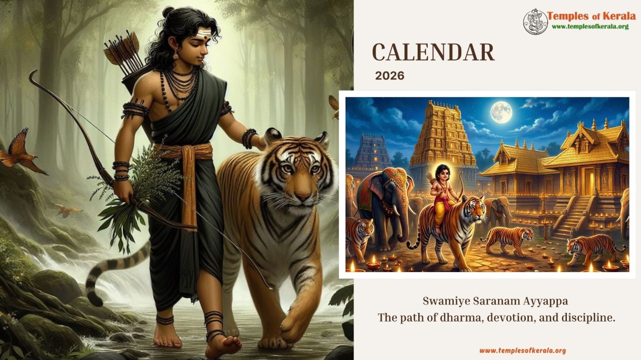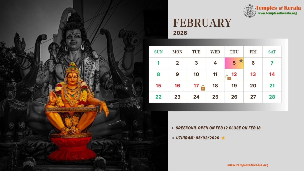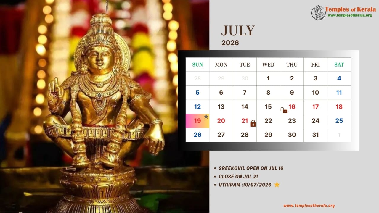 These January–December 2026 calendar images are dedicated to Sabarimala Sree Dharma Sastha Temple and present detailed monthly date layouts with devotional artwork. Each calendar highlights Sree Kovil open and close dates, important pooja days, and major observances. Special attention is given to Uthiram (Uthram) nakshatram days, marking them clearly for devotees. The combination of sacred visuals and practical temple information helps worshippers plan darshan and rituals throughout the year.