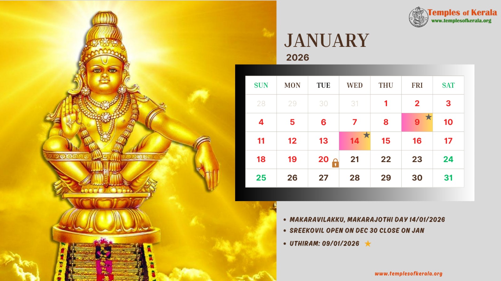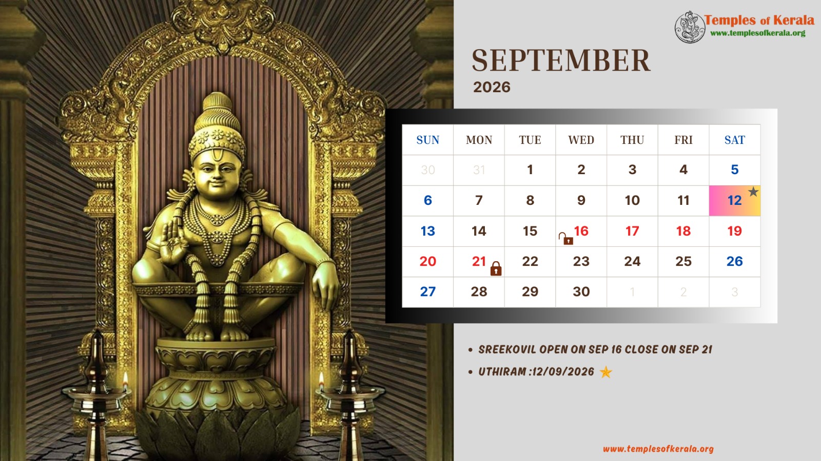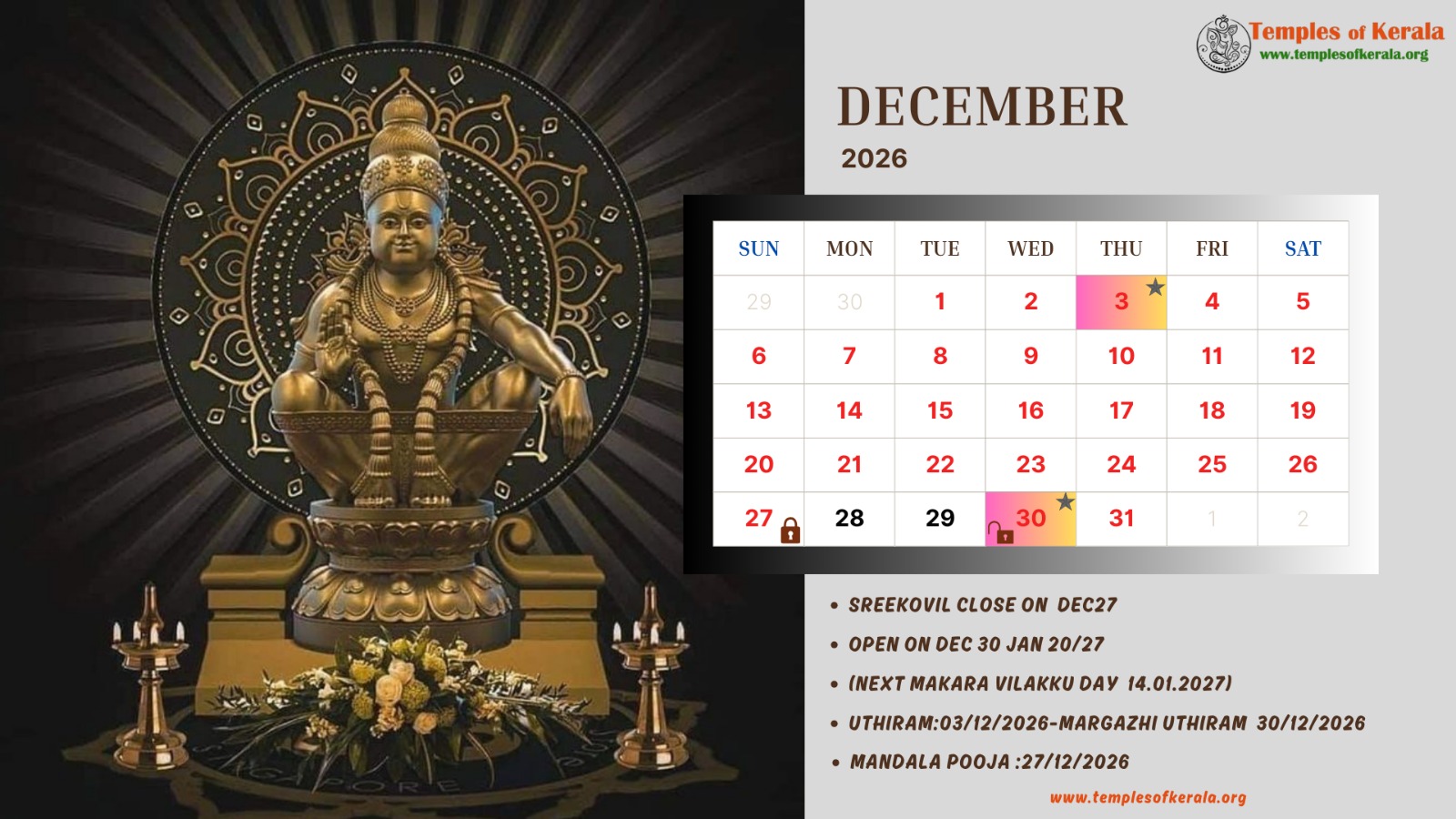 These January–December 2026 calendar images are dedicated to Sabarimala Sree Dharma Sastha Temple and present detailed monthly date layouts with devotional artwork. Each calendar highlights Sree Kovil open and close dates, important pooja days, and major observances. Special attention is given to Uthiram (Uthram) nakshatram days, marking them clearly for devotees. The combination of sacred visuals and practical temple information helps worshippers plan darshan and rituals throughout the year.
